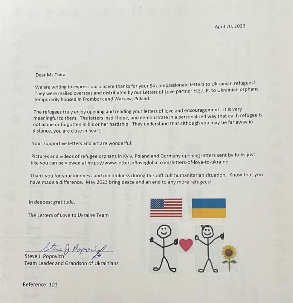VT Seva Alliance Academy Youth Club wrote Letters of Love to the Ukrainian refugees on April 29th, 2023 to instill hope and demonstrate in a personalized way that each refugee is not alone during this hardship. The refugees highly appreciated the mindfulness and kindness of Alliance Academy youth. They have received a Certificate of Appreciation and a Thank You Letter from the Ukrainian Authorities.